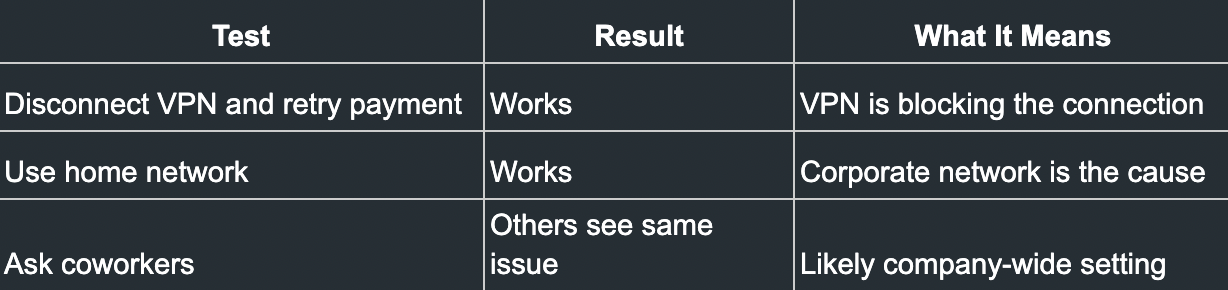 Tip: If payments only fail on your corporate network, this almost always points to VPN or proxy interference.